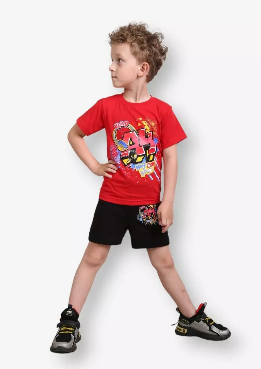 Детский комплект с принтом А4 для мальчиков кулир (состав):Легкое, мягкое, приятное на ощупь гипоаллергенное полотно сделано из приятных для детской кожи ткани: кулир. Кулир. Состав: хлопок 100%. Характеристика материала: тонкий, легкий, воздухопроницаемый, гипоалергенный.