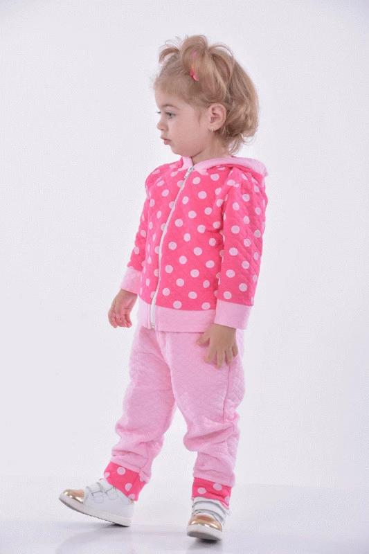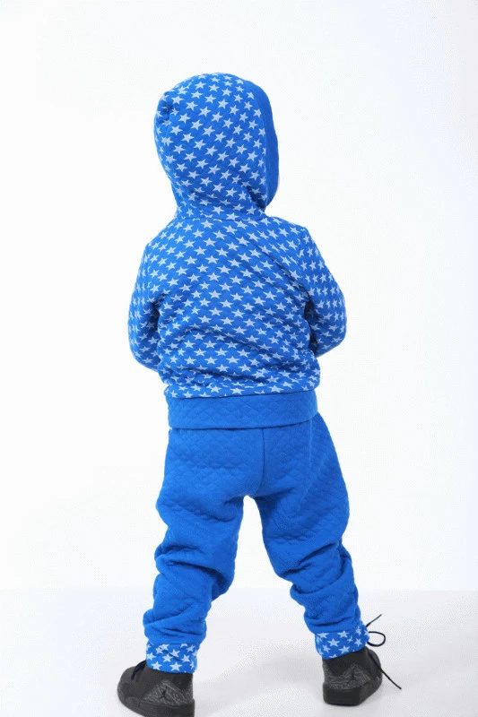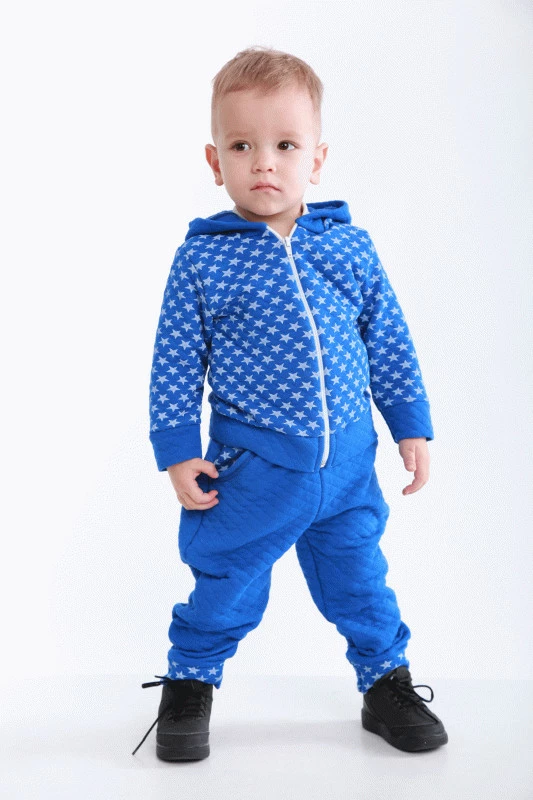 Костюм идёт с капюшоном на молнии, штанишки с карманами, представлен в трёх размерах 23,26,28