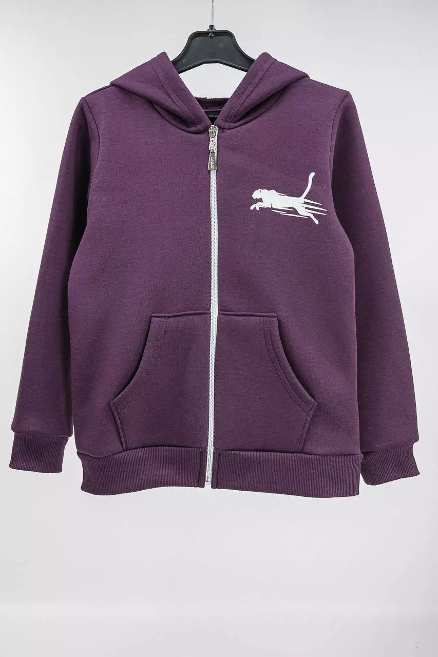 На рукавах и штанинах манжеты. Нанесенный принт. Кофта имеет капюшон и застегивается на молнию.