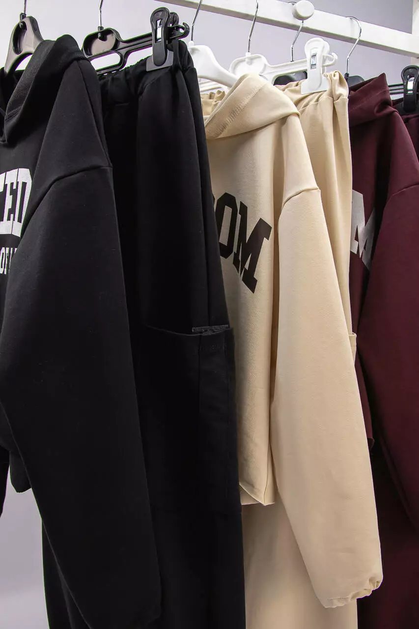 Рукав кофти сделаны под резинку, низ кофты не обработан. Спереди принт. Штани - карго с карманами по бокам. Кофта с большим капюшоном.