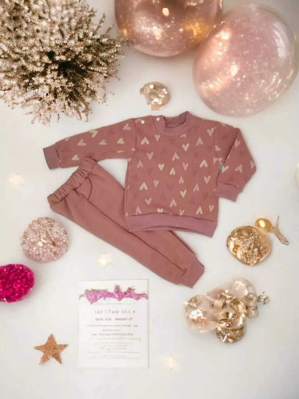 Кофта на плече застегивается на кнопках, рукавах и внизу трикотажный манжет. Брюки имеют карманы, а по низу украшены трикотажным манжетом.